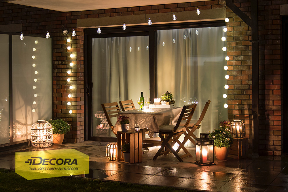 Efektset valgust saab luua peidetud allvalgusega. Mis tähendab lampe mõne objekti all. Näiteks led-ribad terrassi, pingi või laua all. Väga populaarsed on kett-valgustid. See on ideaalne peomeeleolu loomiseks. Seda on saadaval ühe- ja mitmevärviliste pirnidega. Tõmba see pea kohale rippuma, ümber mõne puu, laua, tooli või käsipuu. Meeleolu loomiseks võib kasutada ka küünlaid. Küünaldele leiab Decora kauplusest ka kauneid laternaid. Sõltuvalt küünla suurusest ja kasutussagedusest saab küünlad üsna kiiresti välja vahetada. Kuna tegemist on lahtise leegiga, siis tuletame meelde, et kunagi ära jäta lahtise leegiga küünalt järelvalveta ja tuleohtlikele objektidele liiga lähedale.