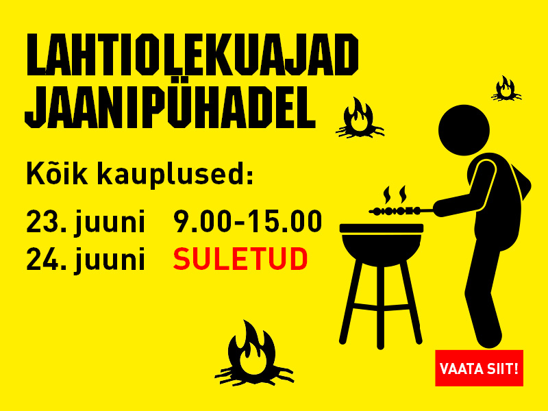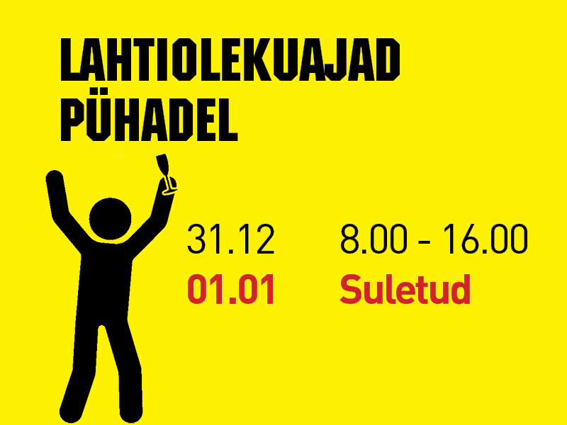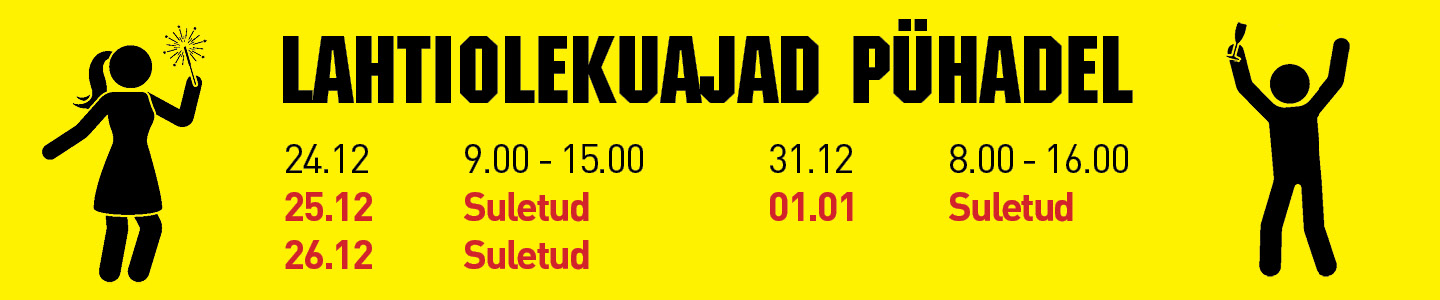 24. - 26.12 ja 1.01 e-poe tellimusi ei komplekteerita ning pöördumistega ei tegeleta.